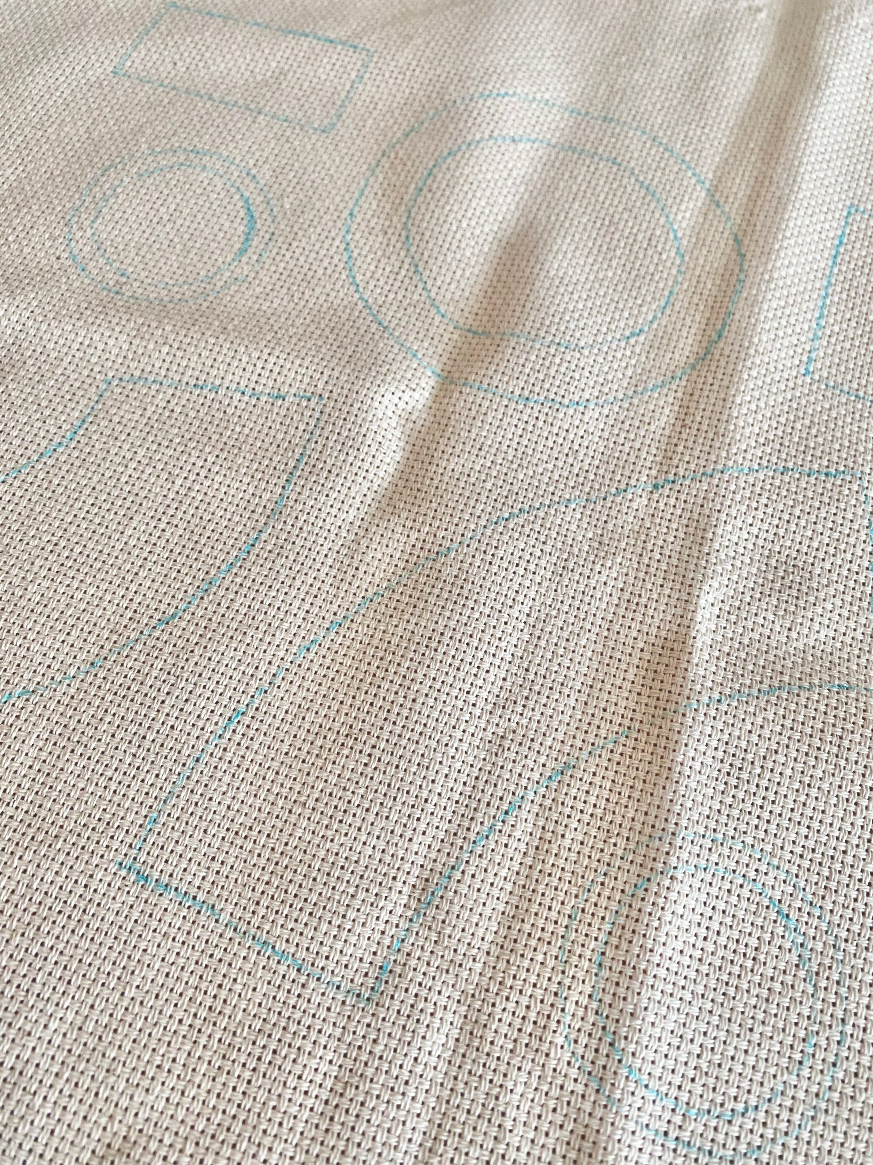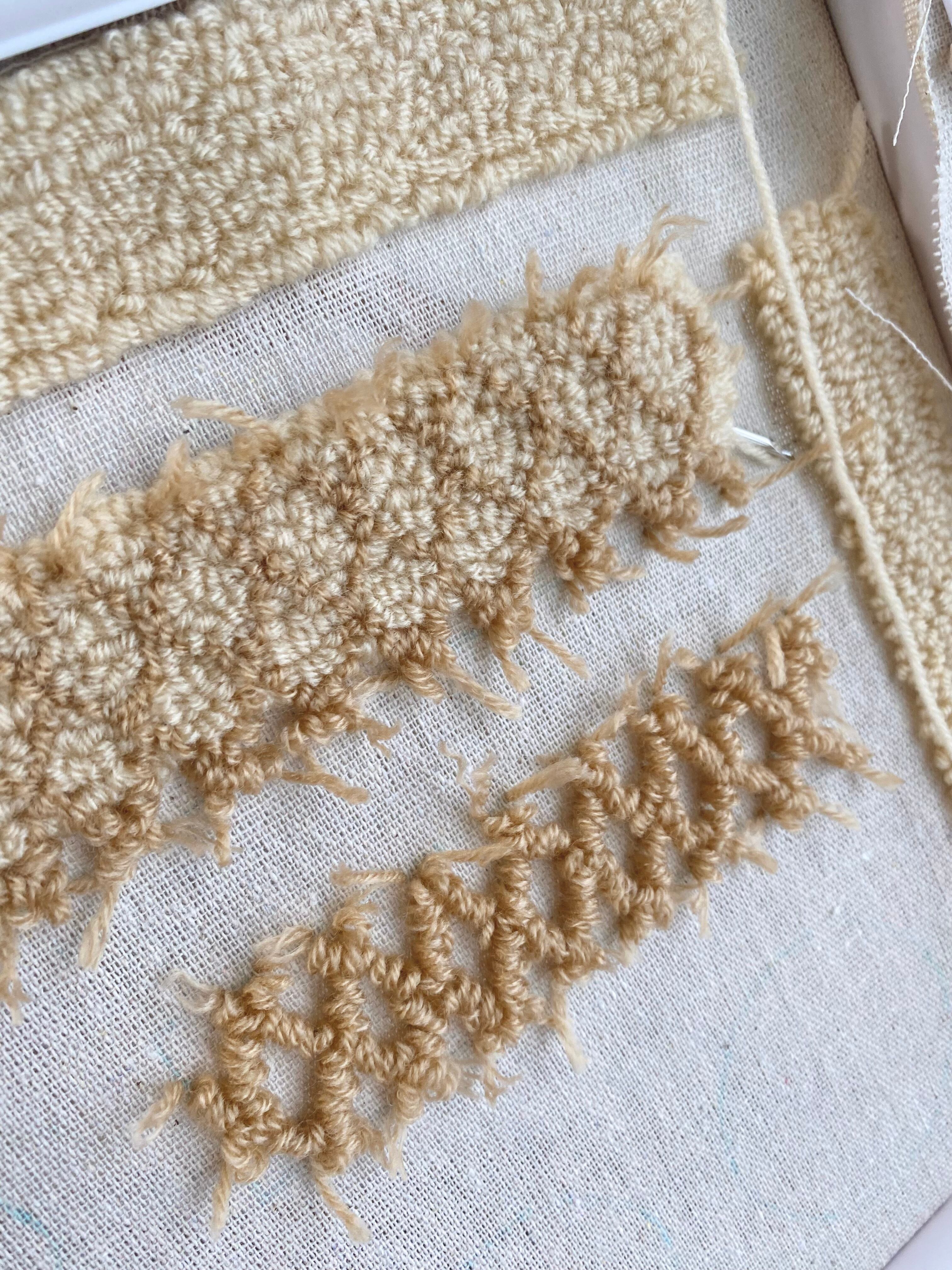 目の粗い生地にひと針ひと針、毛糸を刺していきます